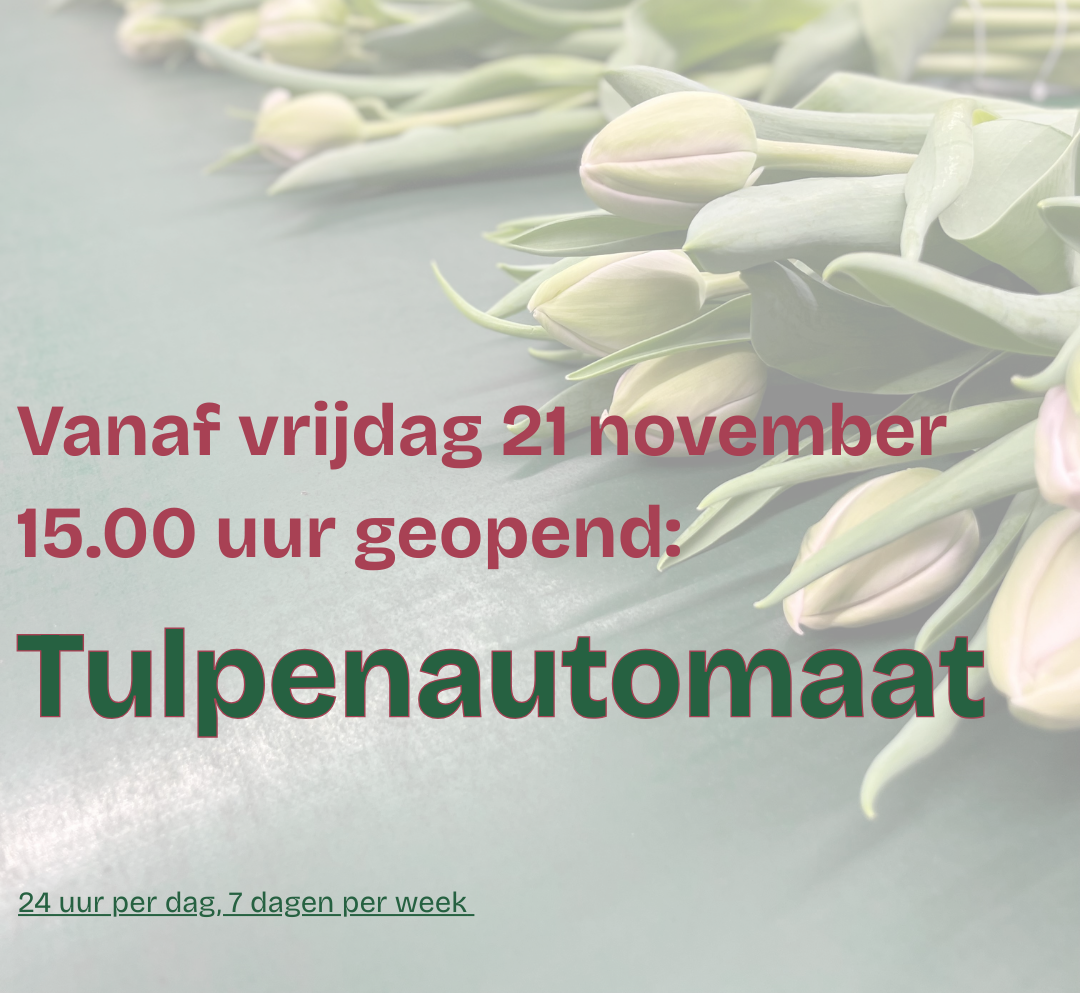 Vanaf vanmiddag (21 november 2025) 15.00 uur geopend: onze tulpenautomaat! Vanaf vanmiddag 15.00 uur is de automaat weer gevuld met prachtige bossen tulpen, vers uit de kas en klaar om bij jullie in huis te stralen Zien we jou ook op de Tulpenkade voor een mooie bos? Prijzen tulpenseizoen 2025/2026: 20 stelen: € 8,50 30…